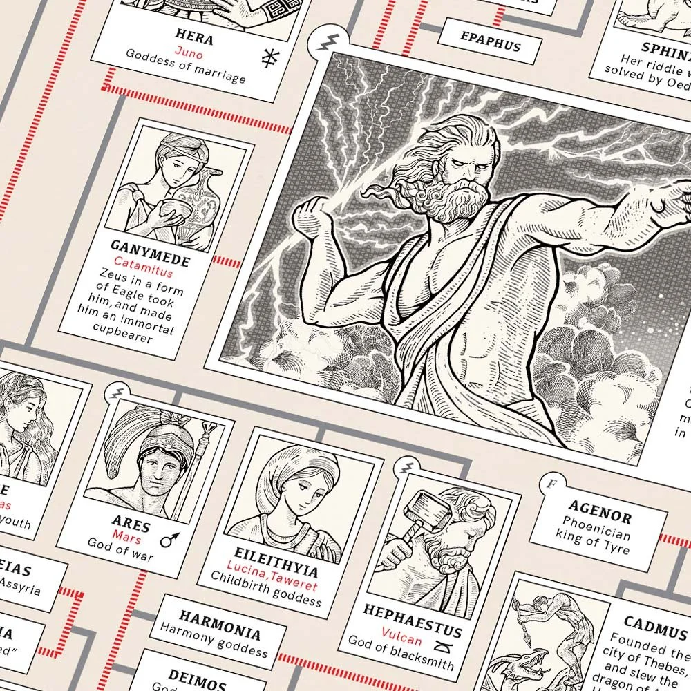 This Greek Mythology Genealogy poster includes Titans, Olympians, hybrids, monsters, and mortals.
